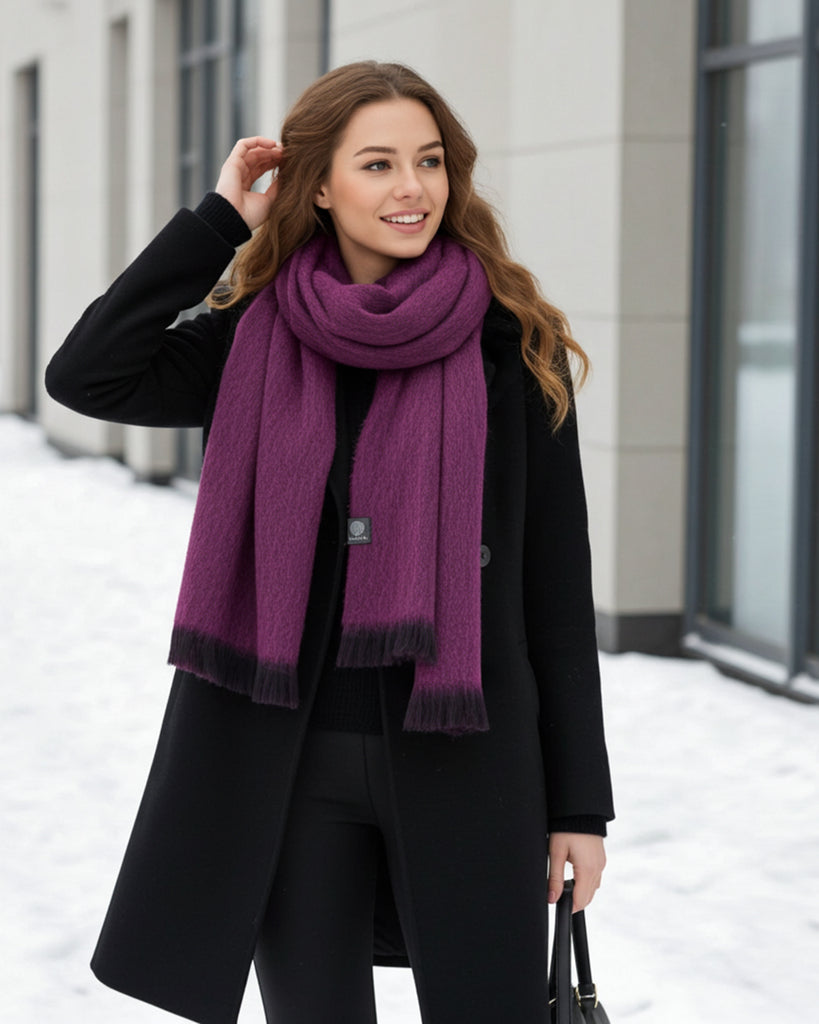 Take a sip of fine style with a wine-colored, Ruby alpaca scarf. And you know what they about wine and how it gets better with age? This alpaca scarf has a unique natural crimp that gives the accessory incredible durability and elasticity. Brace yourself for a long and lasting relationship with it. Our alpaca scarves are soft, lightweight and durable. We'll drink to that!